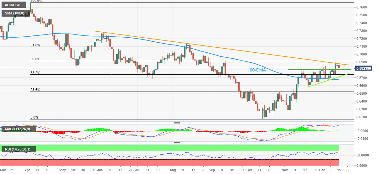 However, multiple tops marked since mid-November, near the 0.6800 round figure, could challenge the AUD/USD bears.