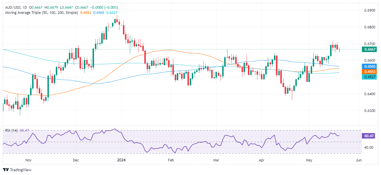 The Australian Dollar registered losses of 0.03% against the US Dollar as Federal Reserve officials hitting the wires were reluctant to hint at when rate cuts begin. Consequently, US Treasury bond yields fell, while the Greenback stood tall, flat at around 104.62. The AUD/USD trades at 0.6668, virtually unchanged as Wednesday’s Asian session begins.