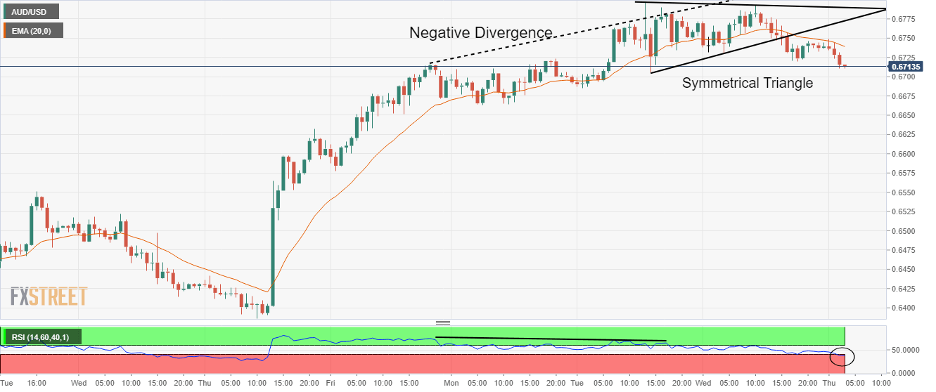 On an hourly scale, the asset has witnessed an expansion in volatility after a downside break of the Symmetrical Triangle formed around Tuesday’s high at 0.6800. Earlier, the major displayed a loss in the upside momentum after a formation of bearish negative divergence. The asset was continuously forming higher highs while the momentum oscillator, Relative Strength Index (RSI) (14) formed a lower high. Also, the RSI (14) has shifted into the bearish range of 20.00-40.00, which indicates that the downside momentum has been activated.