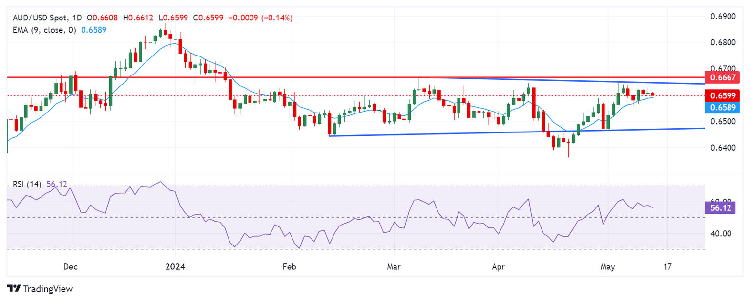 The Australian Dollar trades around 0.6600 on Tuesday. The AUD/USD pair consolidates within a symmetrical triangle pattern. Additionally, the 14-day Relative Strength Index (RSI) suggests a bullish inclination as it remains above the 50 level.