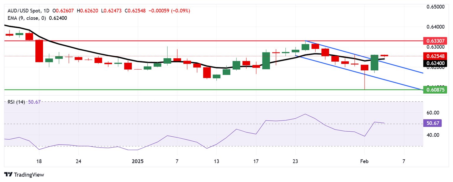 The AUD/USD pair may find immediate support at the nine-day Exponential Moving Average (EMA) near 0.6240, followed by the upper boundary of the descending channel. A pullback to the channel would reinforce the bearish bias, potentially driving the pair toward the lower boundary of the descending channel around 0.6140.
