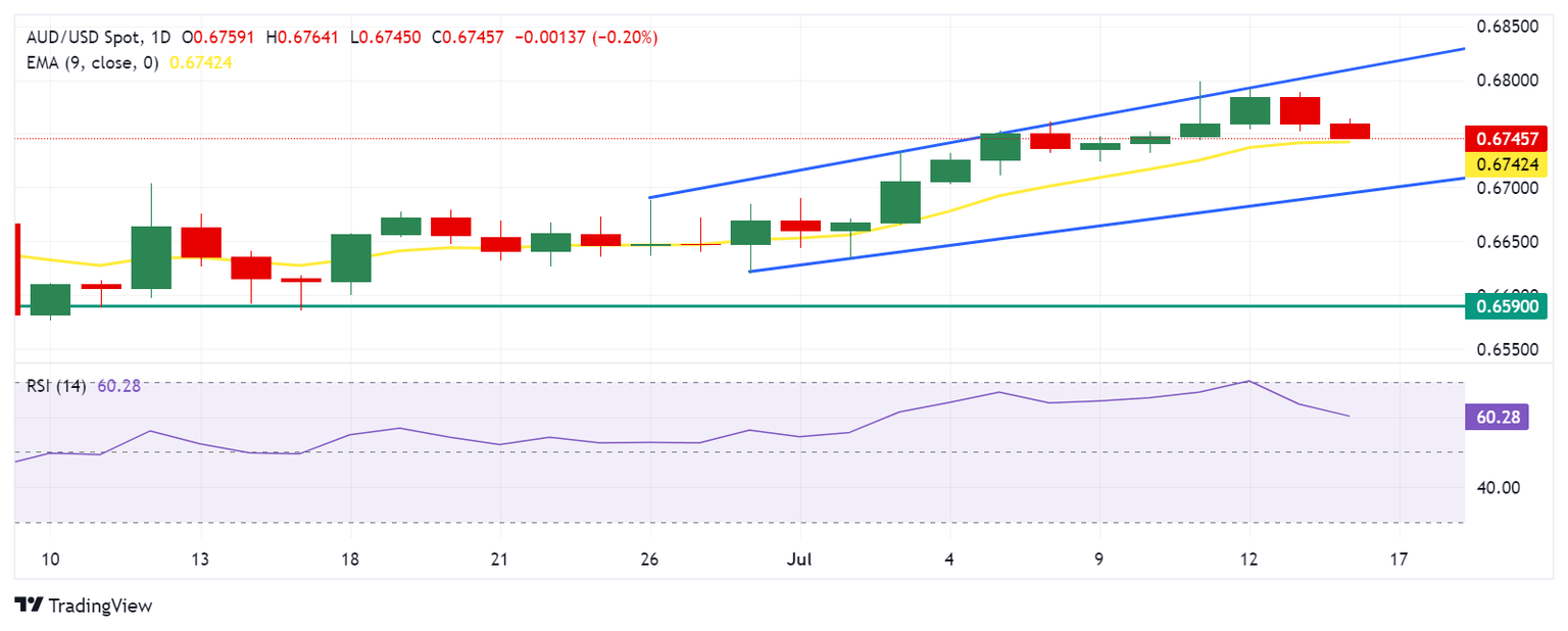 On the downside, immediate support appears around the nine-day Exponential Moving Average (EMA) at 0.6743. Further support is seen near the lower boundary of the ascending channel at 0.6695. A break below this level could push the AUD/USD pair toward the throwback support at 0.6590.
