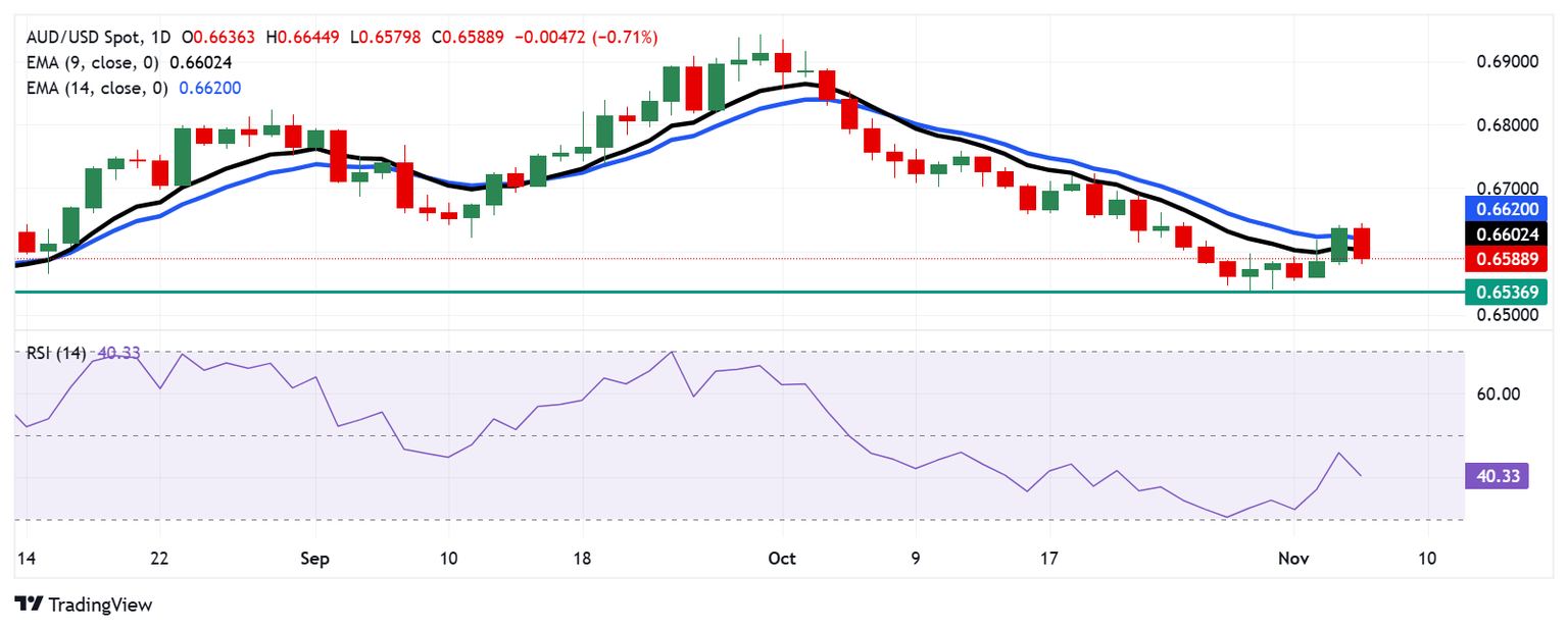 The AUD/USD pair trades near 0.6590 on Wednesday, with technical indicators on the daily chart suggesting a potential continuation of the bearish trend. The pair has slipped below the nine- and 14-day Exponential Moving Averages (EMAs), signaling downward momentum. Additionally, the 14-day Relative Strength Index (RSI) remains below the 50 mark, further supporting a bearish outlook for the pair.