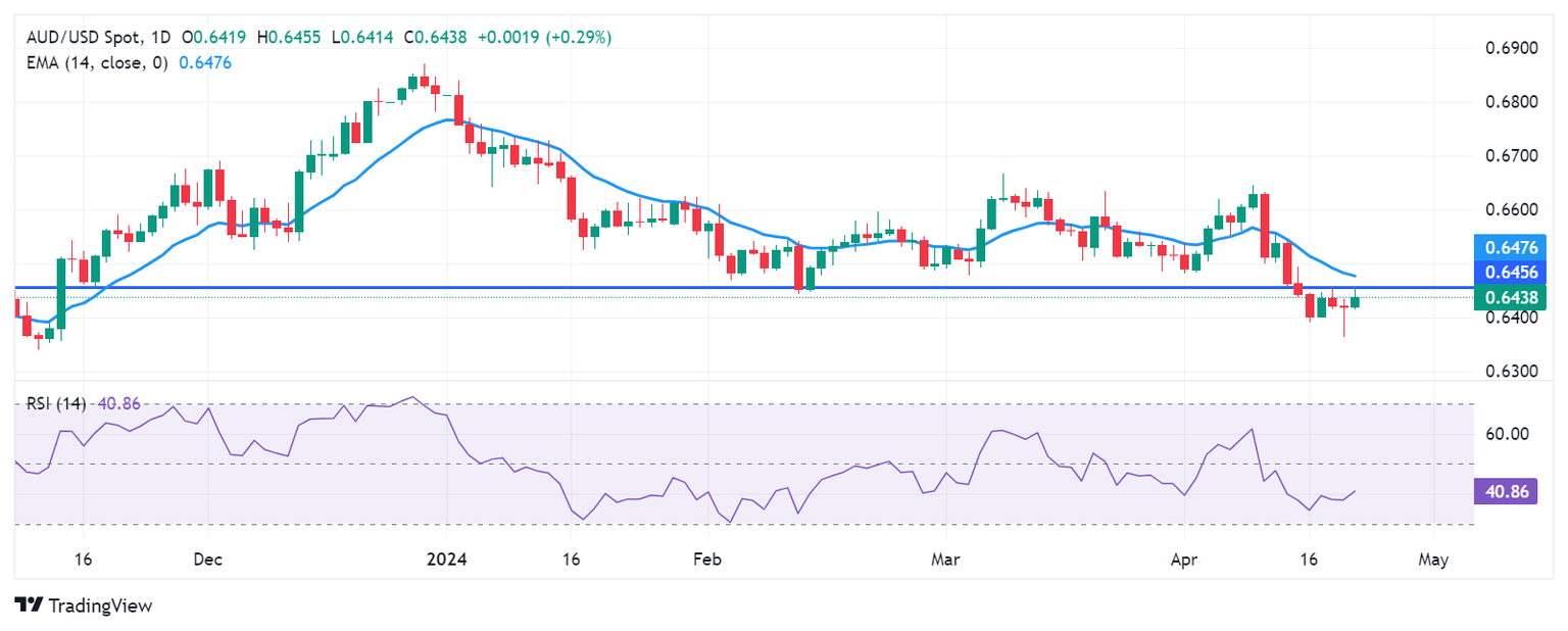 The Australian Dollar trades around 0.6440 on Monday. The AUD/USD pair remains below the pullback resistance of around 0.6456, along with the 14-day Relative Strength Index (RSI) remaining below the 50-level, suggesting a bearish sentiment. Notable support is identified at the psychological level of 0.6400. A break below the latter could put pressure on the AUD/USD pair to revisit the previous week’s low of 0.6362, followed by the major level of 0.6350.