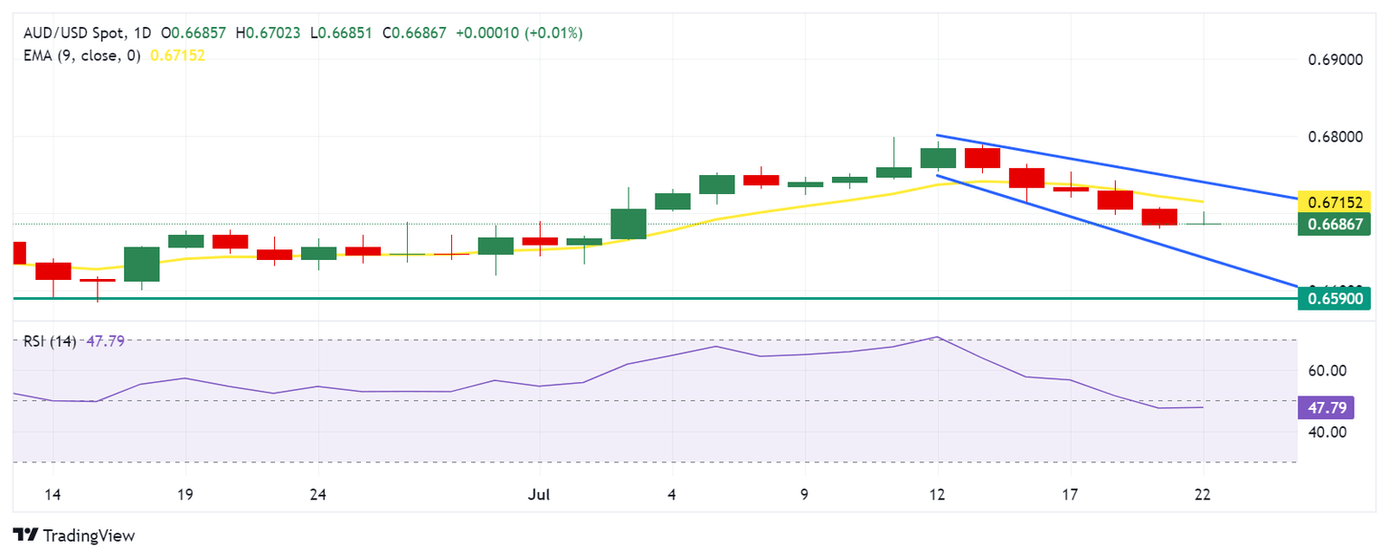 The Australian Dollar trades around 0.6690 on Monday. The daily chart analysis shows that the AUD/USD pair depreciates within a descending channel, signaling a bearish bias. Although the 14-day Relative Strength Index (RSI) is slightly below the 50 level, suggesting an emergence of a bearish trend.