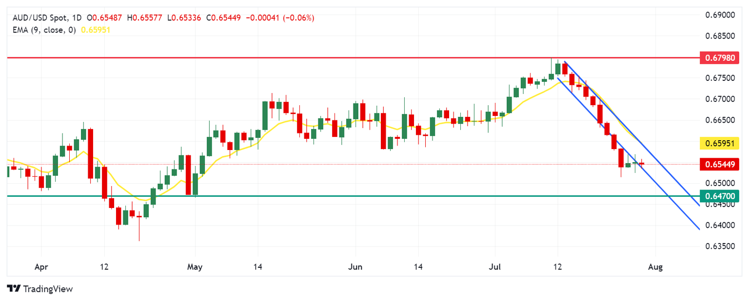 The Australian Dollar trades around 0.6550 on Tuesday. The daily chart analysis shows that the AUD/USD pair treks the path of a downtrend line. The 14-day Relative Strength Index (RSI) is hovering at the oversold 30 level, indicating that the currency pair may be poised for a potential upward correction soon.
