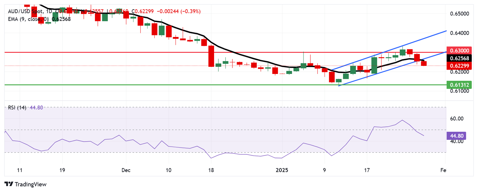 The AUD/USD pair trades near 0.6230 on Wednesday, having broken below the ascending channel on the daily chart, signaling a shift toward a bearish bias. Additionally, the 14-day Relative Strength Index (RSI) has dropped below the 50 level, reinforcing the bearish sentiment in the market.