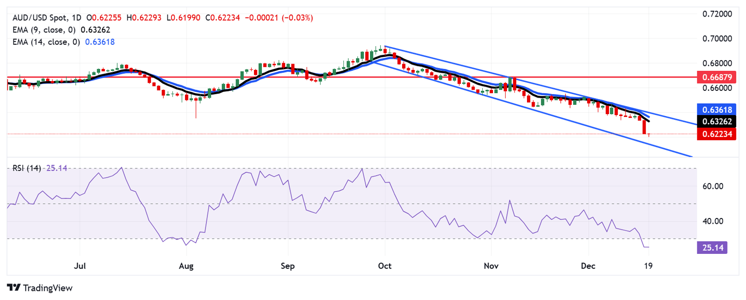 The AUD/USD pair trades near 0.6220 on Thursday. Analysis of a daily chart suggests a prevailing bearish bias as the pair moves downwards within a descending channel pattern. However, the 14-day Relative Strength Index (RSI) has broken below the 30 level, indicating an oversold situation and a potential for an upward correction soon.