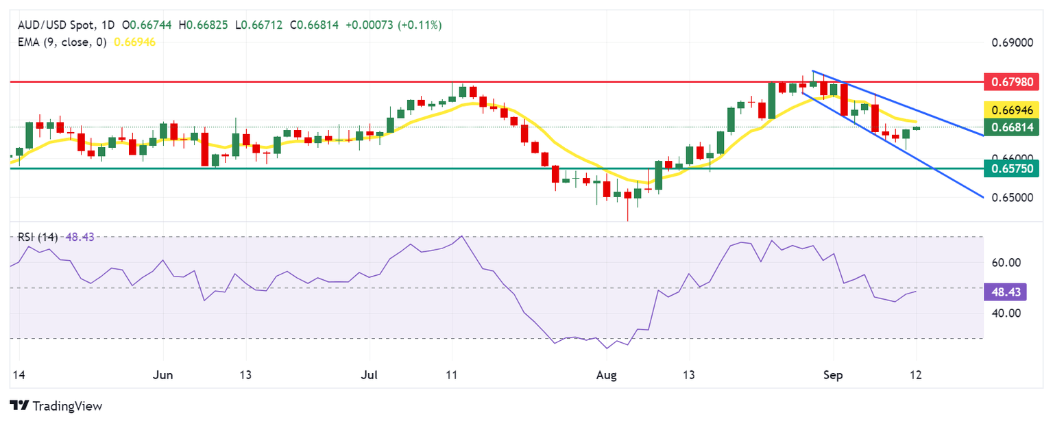 The AUD/USD pair trades near 0.6680 on Thursday, with technical analysis of the daily chart indicating that it remains within a descending channel, signaling a bearish bias. The 14-day Relative Strength Index (RSI) remains below the 50 level, confirming the ongoing bearish trend.
