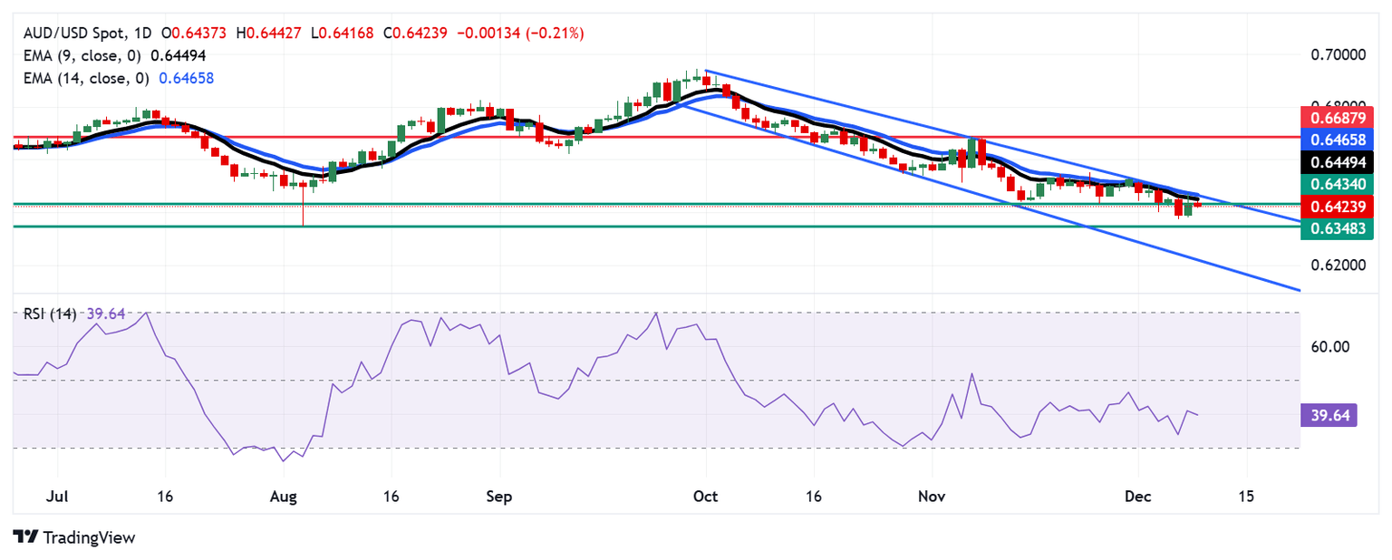 AUD/USD trades near 0.6420 on Tuesday, with bearish momentum gaining strength according to technical analysis. The pair remains confined within a descending channel, and the 14-day Relative Strength Index (RSI) remains below 50, indicating sustained negative sentiment.