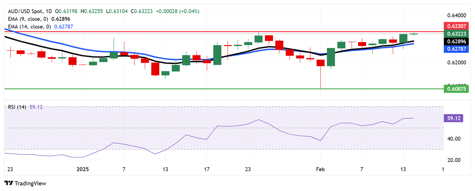 The AUD/USD pair hovers near 0.6320 on Friday, rising above the nine- and 14-day Exponential Moving Averages (EMAs) on the daily chart. This suggests that short-term price momentum is strengthening. Additionally, the 14-day Relative Strength Index (RSI) maintains its position above the 50 mark, reinforcing a bullish bias.