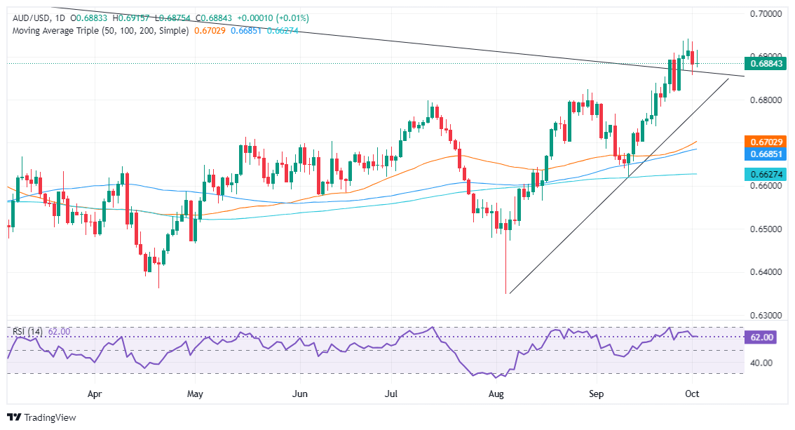 The AUD/USD is set to extend its losses after failing to hold gains above the 0.6900 figure. Although momentum suggests that buyers are in charge, the Relative Strength Index (RSI) is aiming lower in the short term. Therefore, the AUD/USD is tilted to the downside before resuming its ongoing uptrend.