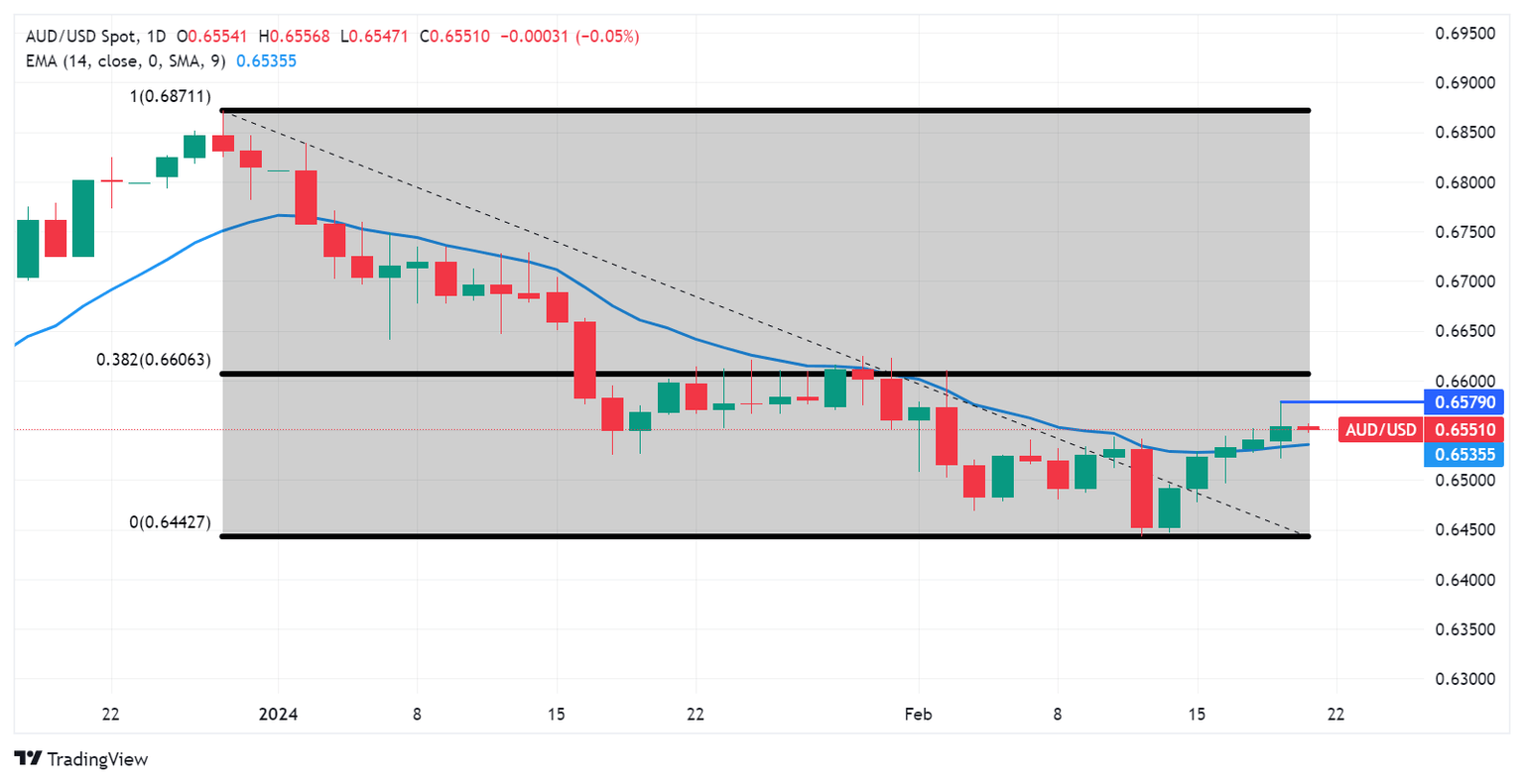 The Australian Dollar traded around the major level at 0.6550 on Wednesday. A break below this major level could meet the immediate support around the 14-day Exponential Moving Average (EMA) at 0.6535 followed by the psychological support level of 0.6500. On the upside, the AUD/USD pair could retest the three-week high at 0.6579 followed by the resistance zone around the psychological level of 0.6600 and 38.2% Fibonacci retracement level of 0.6606.