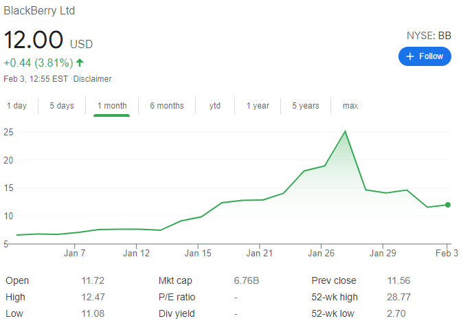 February 3: Shares in Blackberry (BB) suffered on Tuesday as the ramifications of the recent wallstreetbets rally continued to be felt. Markets, in general, were buoyed by the return to "normality" as many seasoned traders put it. But the retail-driven stocks continued to suffer as the long thesis unwound. BB shares fell over 20% and are currently down another 4% in Wednesday's pre-market session.