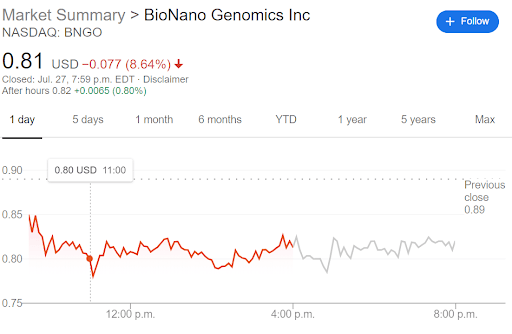 NASDAQ:BNGO fell on Monday, despite more news that should keep investors bullish on the healthcare company. The stock price dropped 8.64% to finish the trading session at $0.8131 per share, nearly wiping out the 14% rise from Friday of last week. BioNano briefly touched a low of $0.78 before finishing out strong, climbing back above $0.80 to end the day. Surprisingly, there was a higher than average volume trading throughout the day, which is another relatively positive sign for investors who have remained loyal to the company.
