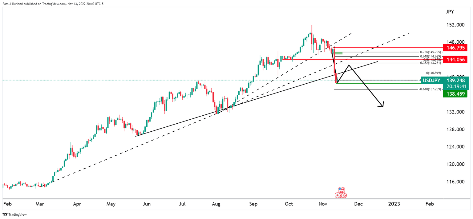 The daily chart, above, shows that the yen is now above critical resistance, USD/JPY support. 133.00/50 is the next objective.
