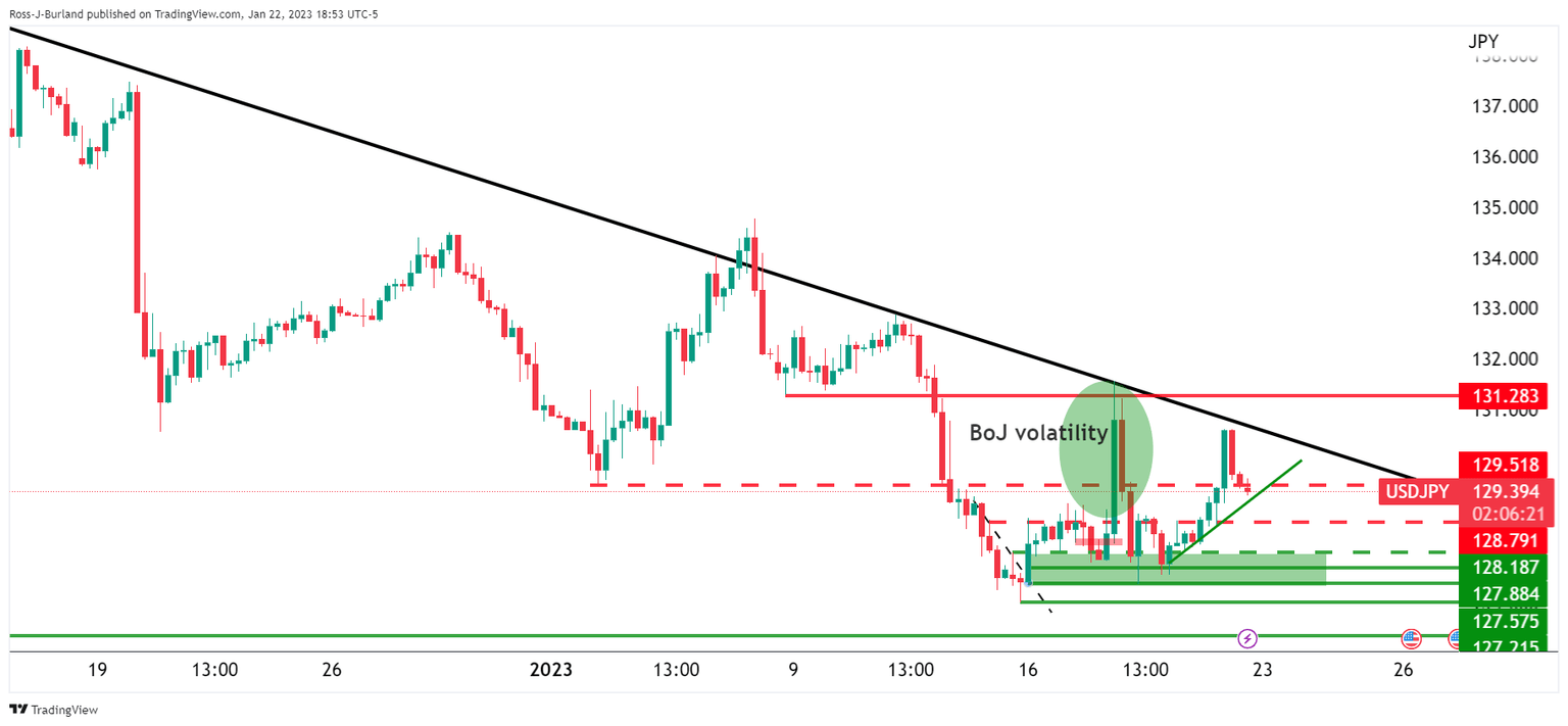 This was a surprise to investors as policymakers were said not to be seeking a looser grip on bond yields after the unexpected tweak of the yield curve control range in December. Instead, the BoJ reiterated it would take extra easing measures if needed. The central bank also explain that short-and long-term policy interest rates would stay at their present or lower levels which helped to keep USD/JPY buoyed above critical support: