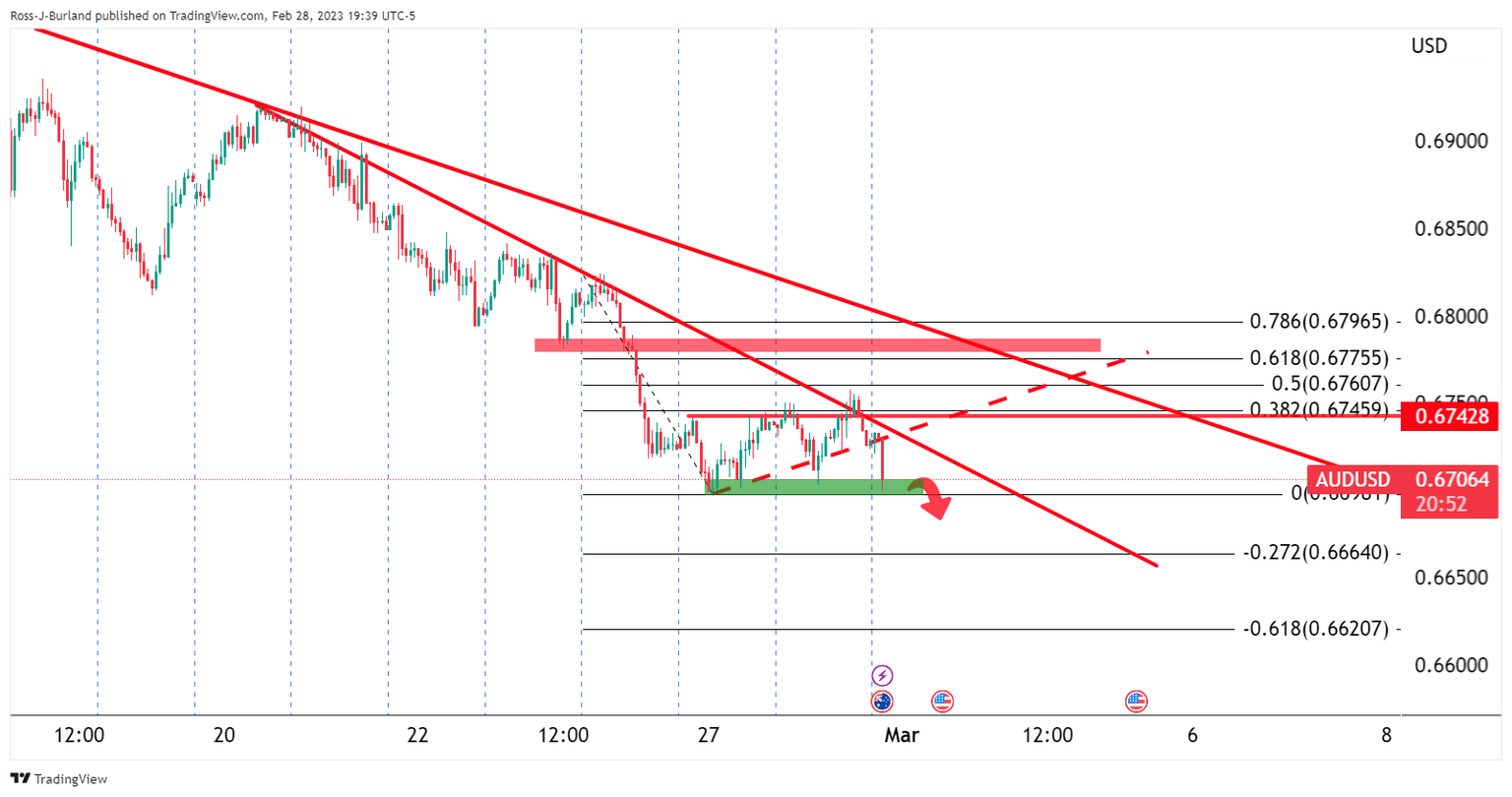 AUD/USD has now broken a trendline support, invalidating the thesis for a stronger correction in the meantime, resisted by the 50% mean reversion of the prior bearish impulse: