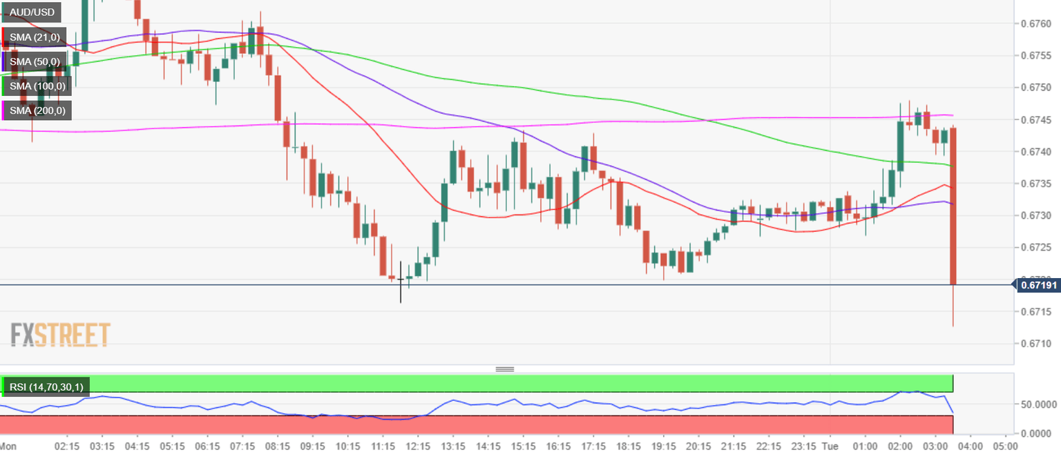 In a knee-jerk reaction to the RBA decision, the AUD/USD pair dropped nearly 30 pips toward 0.6700. At the time of writing, the Aussie is down 0.06% on the day, trading at 0.6720.