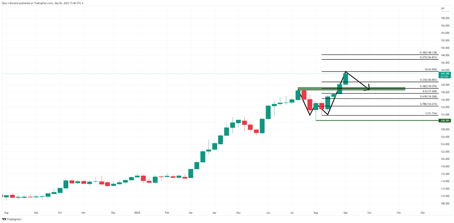 The weekly chart shows the price in a harmonic pattern which could see a move into the prior resistance in due course. As it stands, we have a 38.2% Fibonacci confluence with the prior swing highs near 139 the figure.