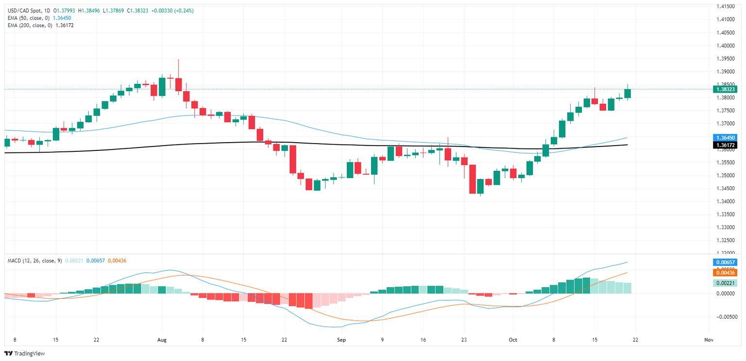 The USD/CAD pair continues its bullish march, trading around 1.3833 on the daily chart after successfully breaching key resistance levels in recent sessions. The price has risen decisively above both the 50-day EMA at 1.3645 and the 200-day EMA at 1.3617, confirming bullish momentum. These moving averages are now acting as significant support levels, reinforcing the upward bias. With the pair trading near its recent highs, the next psychological resistance to watch is the 1.3900 level, followed by a potential retest of 1.4000 if momentum continues.
