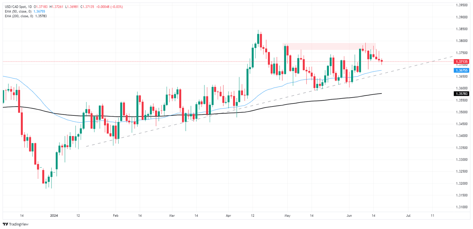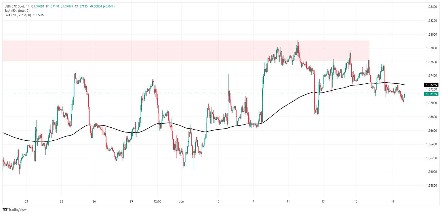 The Canadian Dollar (CAD) is trading thin on Wednesday, holding close to flat against the Greenback and stuck within a fifth of a percent across the major currency board. USD/CAD eased back to the 1.3700 handle before finding a floor in the midweek markets session, but the pair is trading into the low side of median bids at the 200-hour Exponential Moving Average (EMA) near 1.3725.