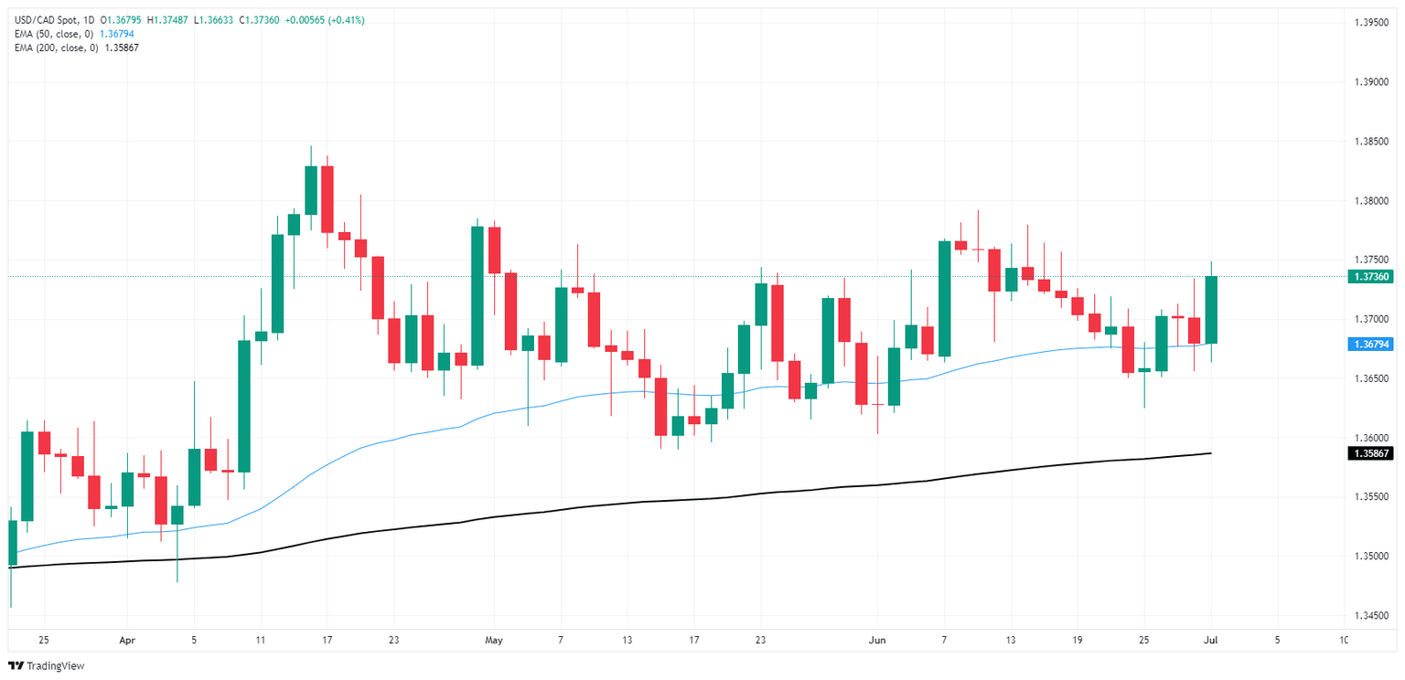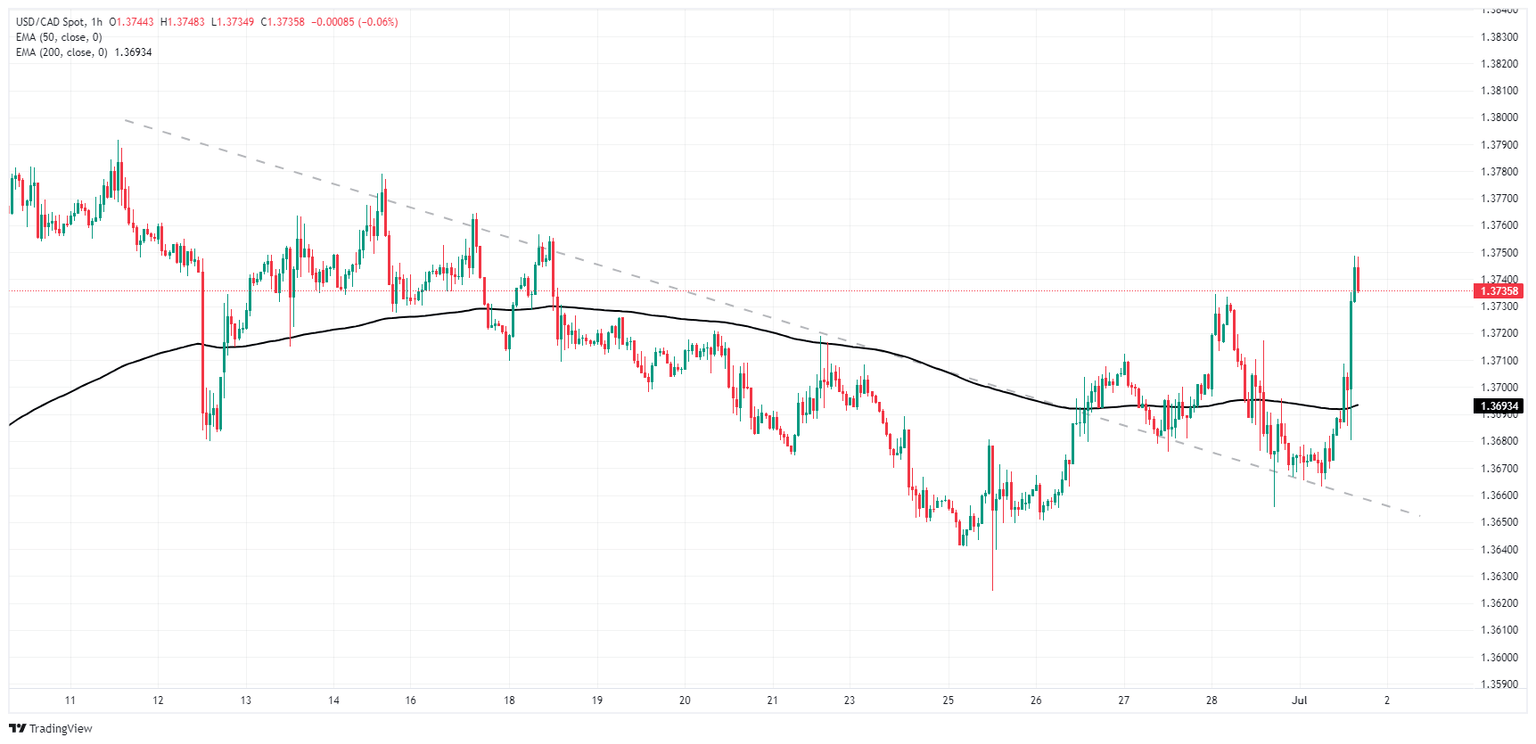 USD/CAD found a fresh multi-week high after testing into 1.3750 on Monday. The pair has recovered ground after bouncing from last week’s plunge below 1.3630. Still, intraday price action continues to trade on the rough side as the pair cycles the 200-hour Exponential Moving Average (EMA).