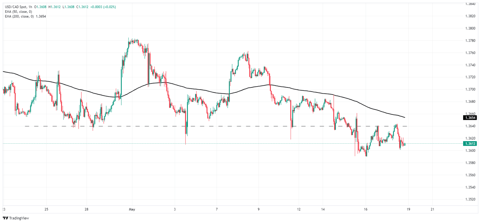 USD/CAD is bidding firmly within recent technical levels with intraday trading stuck to a familiar support and resistance level at 1.3640. Price action remains pinned on the low side of the 200-hour Exponential Moving Average (EMA) at 1.364.