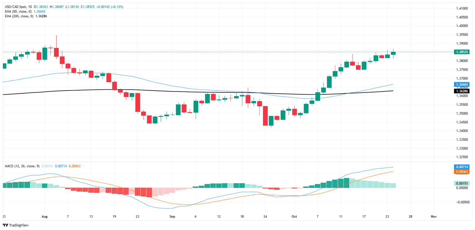 The USD/CAD pair is currently trading in a bullish trend after recovering from a prolonged period of downward movement seen in mid-August through late September. The price has decisively broken above both the 50-day EMA (blue line) at 1.3666 and the 200-day EMA (black line) at 1.3628, indicating a shift in market sentiment towards the upside. The recent bullish momentum has been strong, with the pair consolidating near the 1.3850 level after a steady rise. The moving averages are beginning to converge, suggesting the possibility of a medium-term bullish crossover that would further support upward momentum.