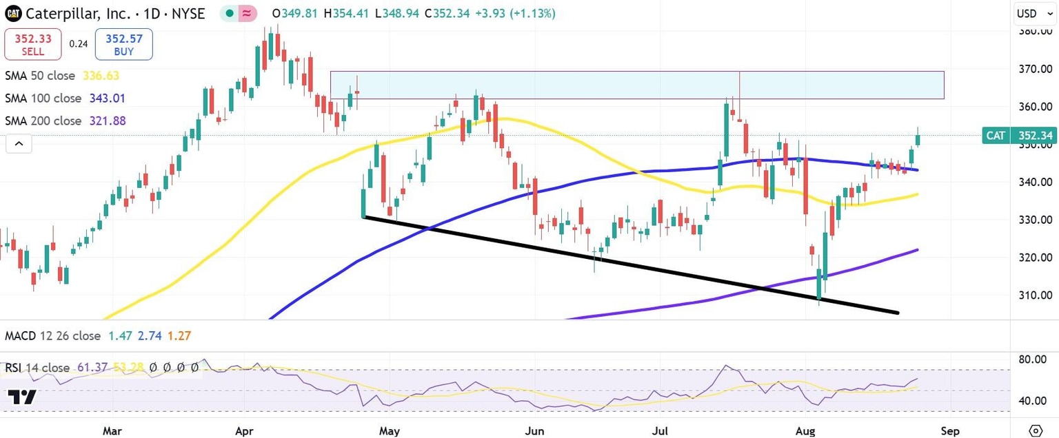 - CAT stock looks likely to retest resistance zone in the $360s.
