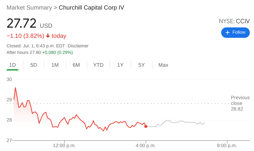 Update July 2: Churchill Capital Corp IV (NYSE: CCOV) has been extending its falls on Friday, shedding over 3.5% and slipping below the $27 level. The broader electric vehicle sector is on the back foot. Ahead of Churchill's merger with Lucid Motors – which will trigger a ticker change to LCID – shares have been taking two steps forward, one step back. Is the current correction a buying opportunity? It is essential to note that trading will be closed on Monday due to the long Independence Day holiday, and that may cause last-minute jitters.