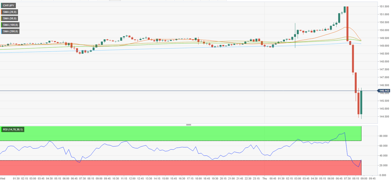 After having touched its highest level since 1980 above 151.00 earlier in the day, the CHF/JPY pair lost over 600 pips in the last hour. As of writing, the pair was down nearly 3% on the day at 145.00.