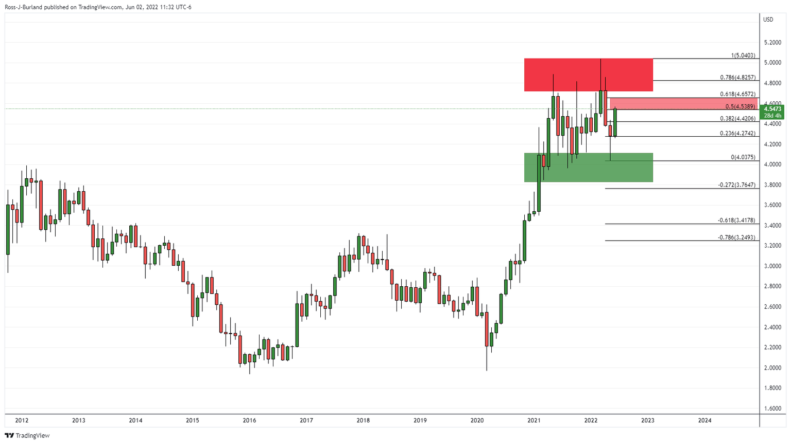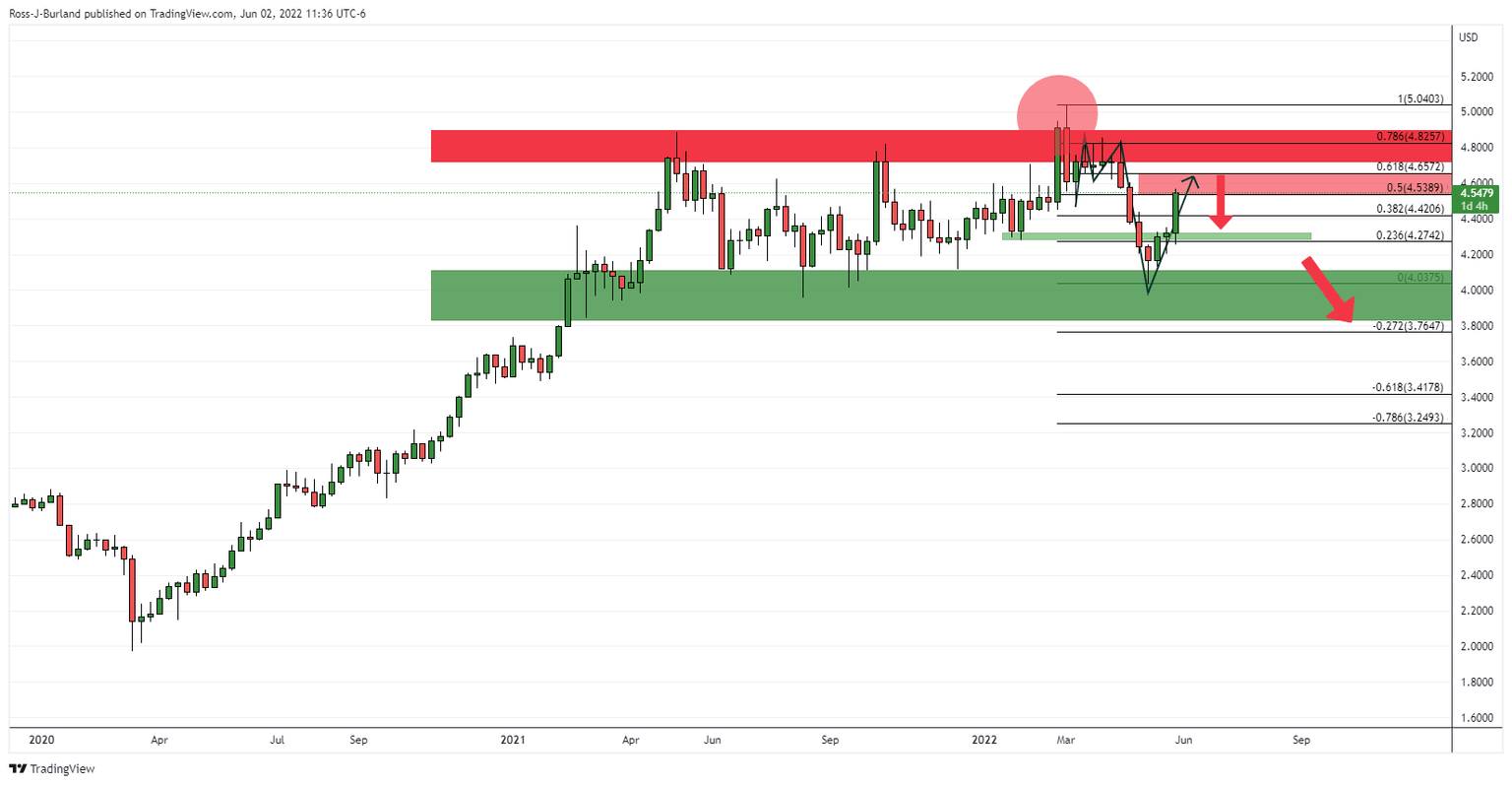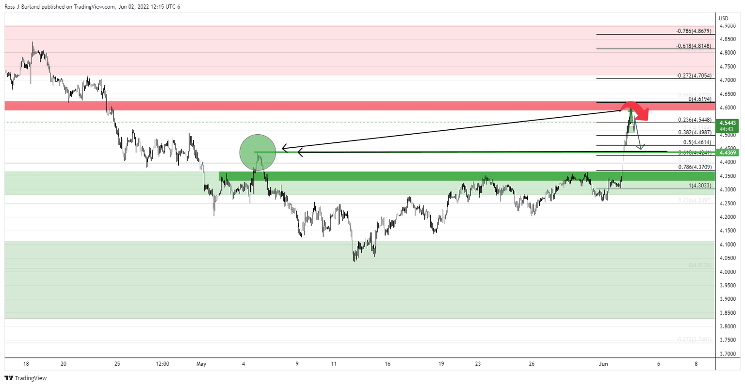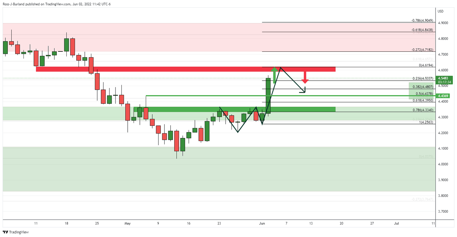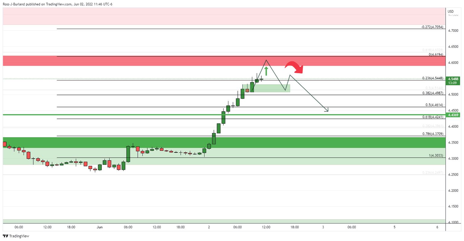On the hourly time frame, the rally is parabolic, besides a brief stall at 4.5330 and likely in need of a meanwhile correction in the coming hours. If the bears manage to break below the potential support structure where the bulls paused for breath previously within this rally, then that will reinforce the case for the move back towards the prior highs: