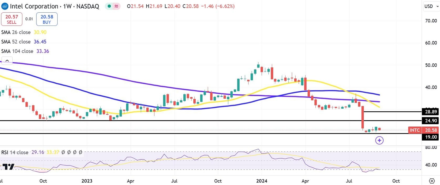 Intel stock is of course trading well below all the relevant moving averages on the weekly chart. The 26-week, 52-week and 104-week Simple Moving Averages (SMAs) are all resting between $30.90 and $36.45, while INTC loses another 6.7% midday on Tuesday to trade at $20.57.