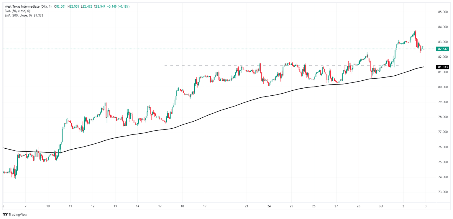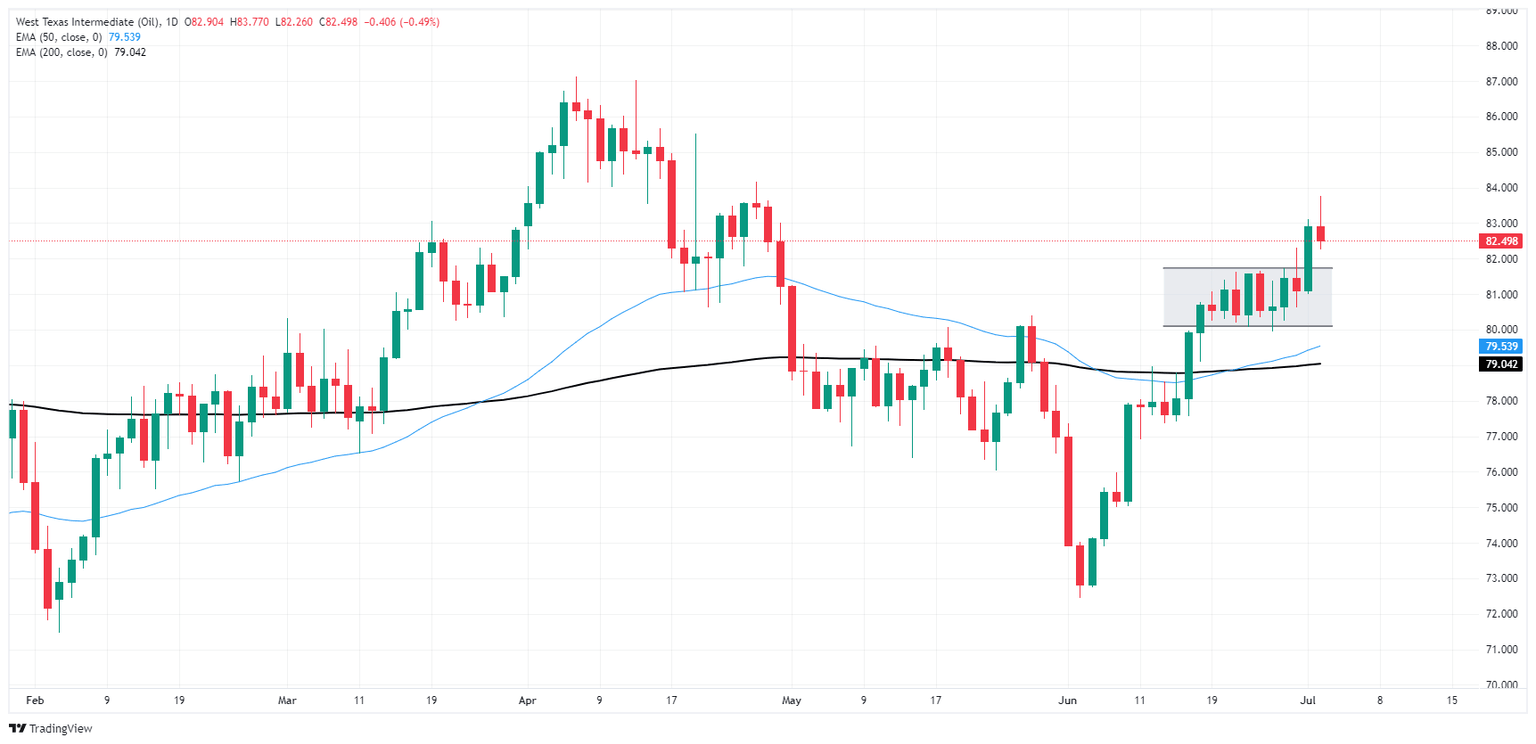West Texas Intermediate (WTI) US Crude Oil briefly clipped into a nine-week peak just shy of $84.00 per barrel on Tuesday before mid-US session market flows pulled barrel bids back down to $82.50.