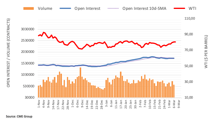 Prices of the barrel of WTI extended the rebound and reached the key $80.00 mark per barrel on Monday. The continuation of the uptrend was amidst diminishing open interest and volume and suggests that a sustainable move beyond this key resistance area (where coincides February and the so far March highs) is not favoured for the time being.