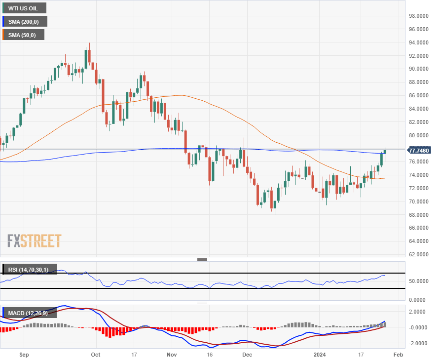 Daily candlesticks have WTI testing into the 200-day SMA near 77.25, with oil bids climbing and setting WTI on pace to close in the green for a sixth of the last eight trading session.