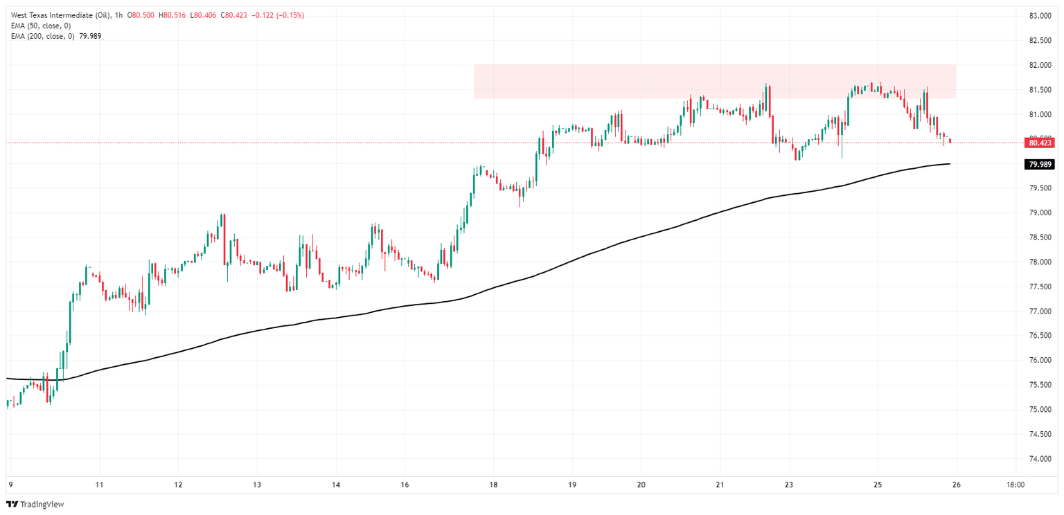 Near-term price action has halted a bullish advance, keeping WTI US Crude Oil prices pinned on the low side of a supply zone above $81.50. Intraday bidding is easing back to the 200-hour Exponential Moving Average (EMA) at the $80.00 handle, and an extended backslide could see barrel bids tumble further into mid-June’s consolidation range below $78.50.