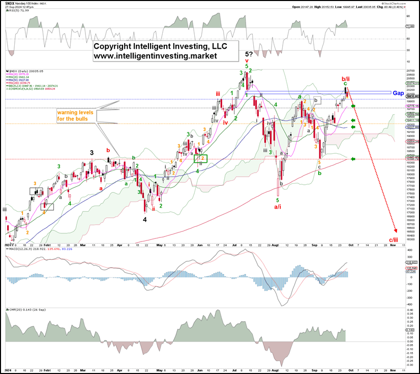 Figure 1. NDX daily chart with detailed Elliott Wave count and technical indicators