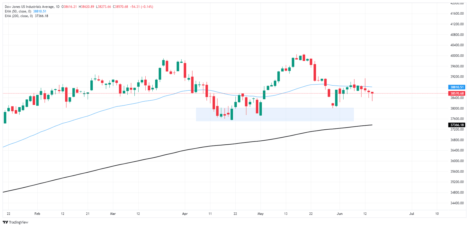 The Dow Jones Industrial Average is on pace to close slightly lower for a fourth consecutive day on Friday, and the index has continued waffle down from recent all-time highs above 40,000.00 set in May. The index continues to hold north of the 200-day Exponential Moving Average (EMA) at 37,369.62, and a demand zone is holding in place to catch any short side pushes below the 38,000.00 handle.