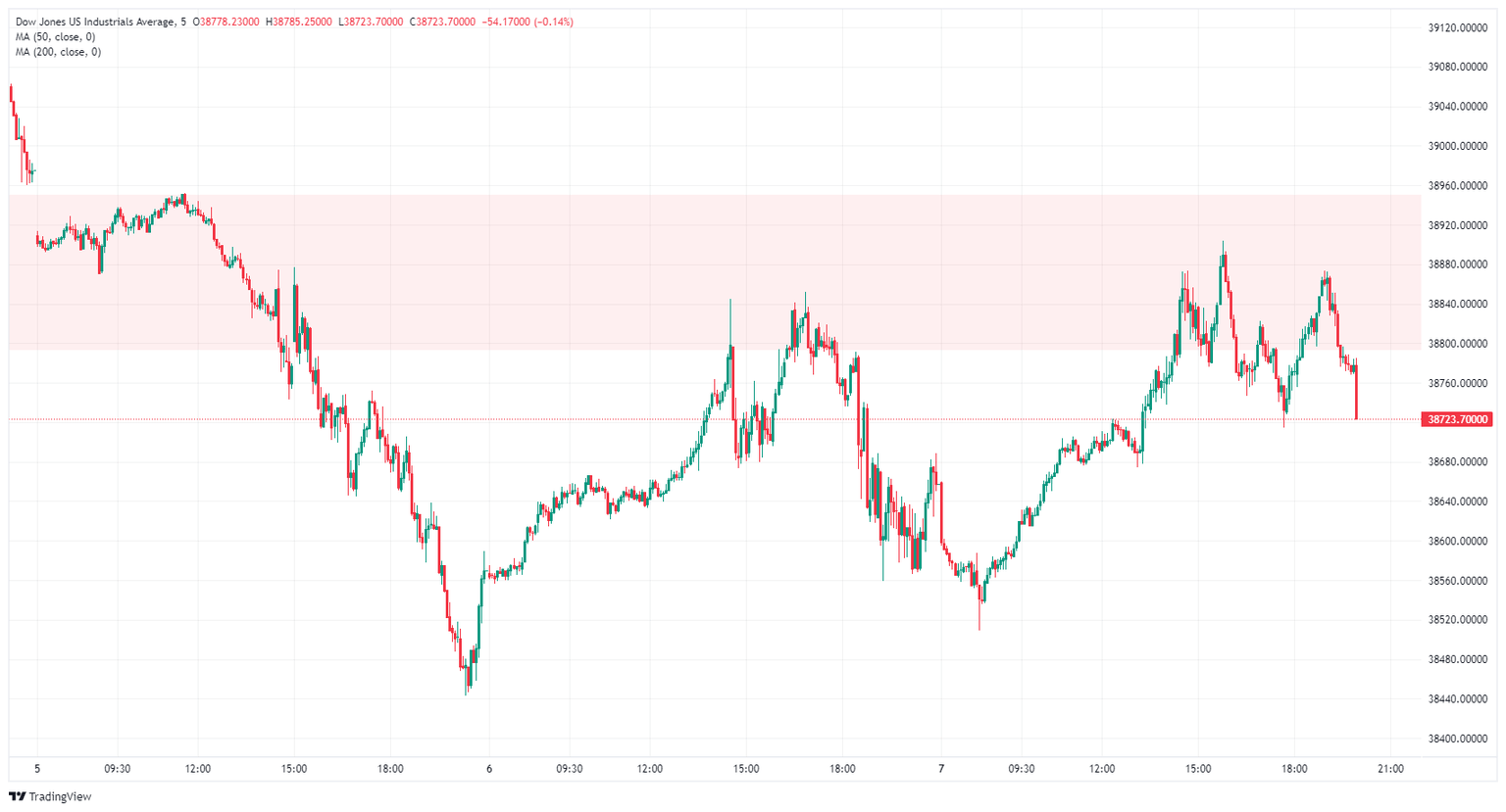 The Dow Jones Industrial Average (DJIA) is struggling to chalk in further ground above 38,800.00 as the index sees intraday technical rejection from a resistance zone priced in from 38,800.00 to 38,950.00. The major equity index is up for Thursday, but gains are looking capped as markets flows pull into the midrange ahead of Friday.