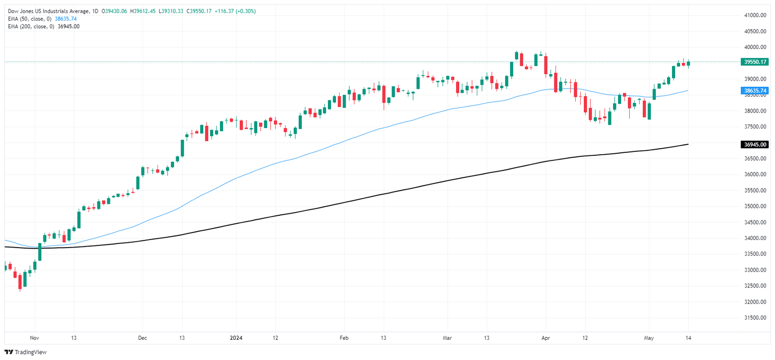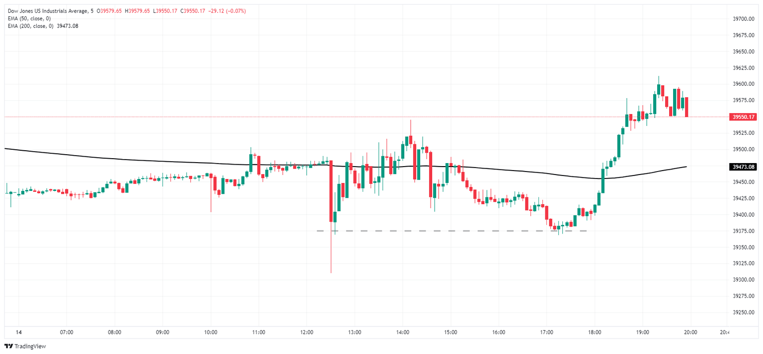 The Dow Jones Industrial Average (DJIA) is mired in intraday technical congestion near 39,400.00 on Tuesday as the major equity index grapples with twisting investor sentiment. The index dumped below 39,320.00 on reaction to inflation data, but the Dow Jones recovered back above the day’s opening bids before treading water. A late break on recovering risk appetite sent the Dow Jones back into the bullish side to end Tuesday, setting the day's high just above 39,600.00.