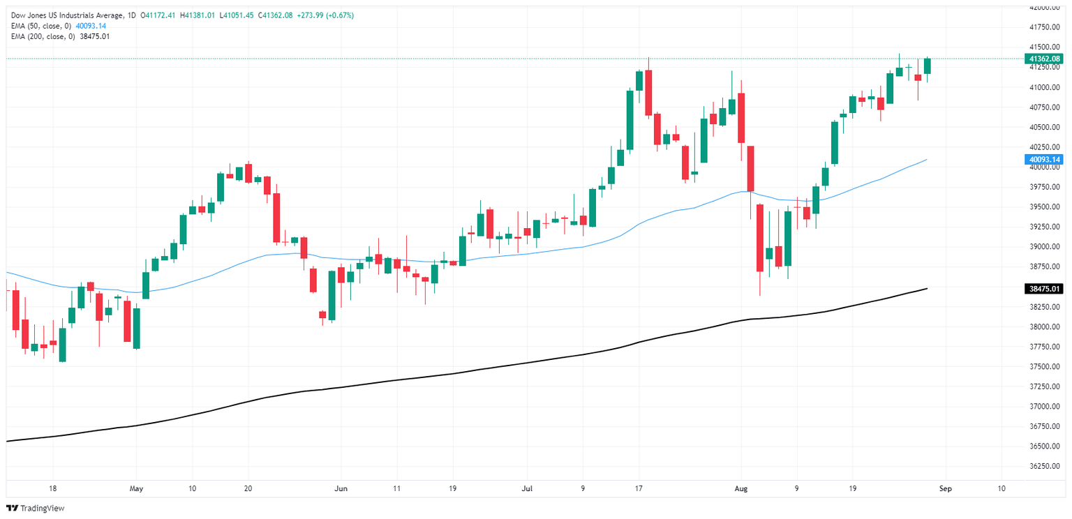 The Dow Jones Industrial Average (DJIA) rose 1.1%, or 450 points, on Thursday, buoyed by a forecast beat in US Gross Domestic Product (GDP) growth numbers in Q2. US Personal Consumption Expenditure Price Index (PCE) inflation data, due on Friday, is still the key print of the week. Markets remain confident that the Federal Reserve (Fed) is on pace to kick off a rate-cutting cycle in September. An afternoon pullback in the equity space dragged the Dow Jones lower, squeezing the day's gains to around 200 points.