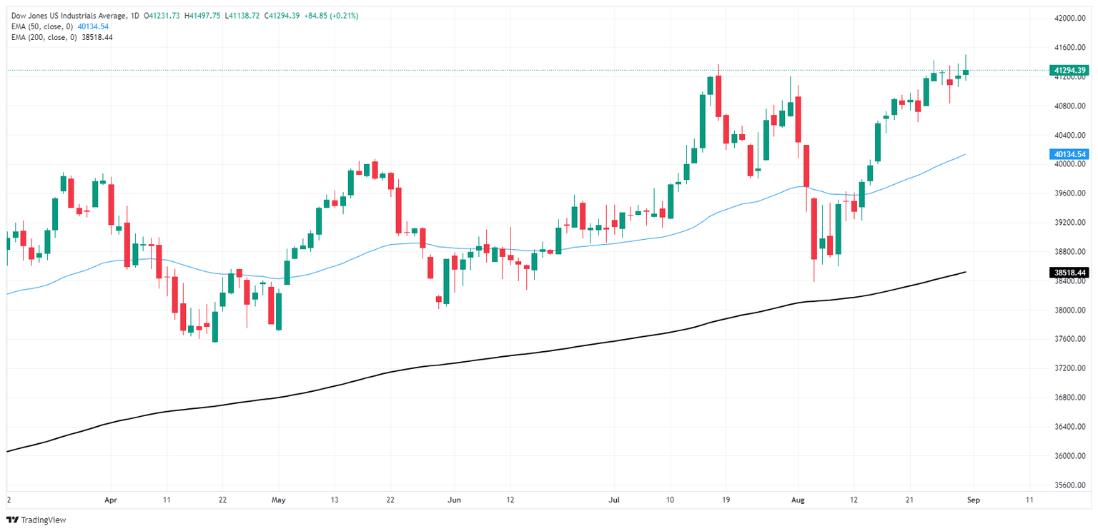 Bullish momentum continues to strain against its tether, keeping the Dow Jones testing new record highs and keeping price action pinned deep in bull country. The index is trading well north of the 200-day Exponential Moving Average (EMA) at 38,513, and the nearest technical floor in place to catch a downside correction is parked at the 50-day EMA just above the 40,000 major price handle.