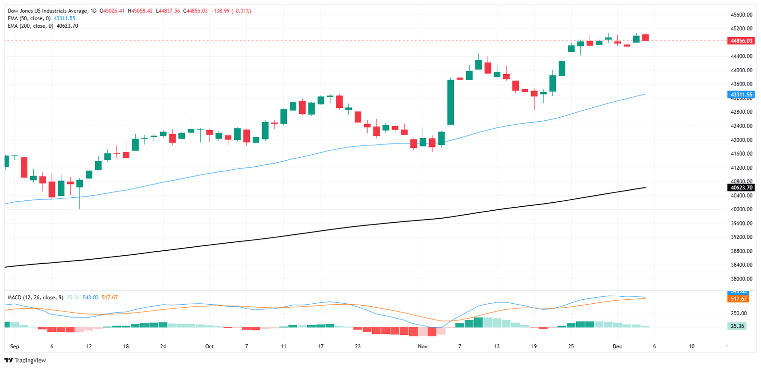 The Dow Jones is grinding into a near-term sideways pattern as daily candlesticks struggle to find momentum in either direction. The major equity index is grappling with the 45,000 handle, but a meaningful downside pullback has yet to materialize after the DJIA found fresh record highs last week.