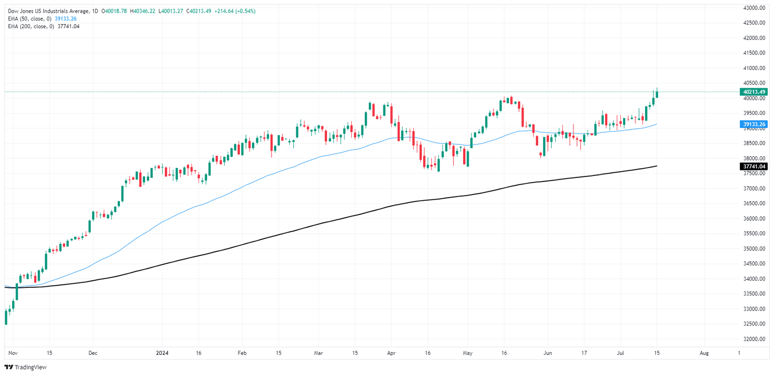 The Dow Jones is holding close to the 40,200.00 handle on Monday after setting a fresh record high, and bidders are trying to keep price action propped up above the 40,000.00 major handle. Daily candlesticks continue to hold on the high side of the 200-day Exponential Moving Average (EMA) rising towards 38,000.00.