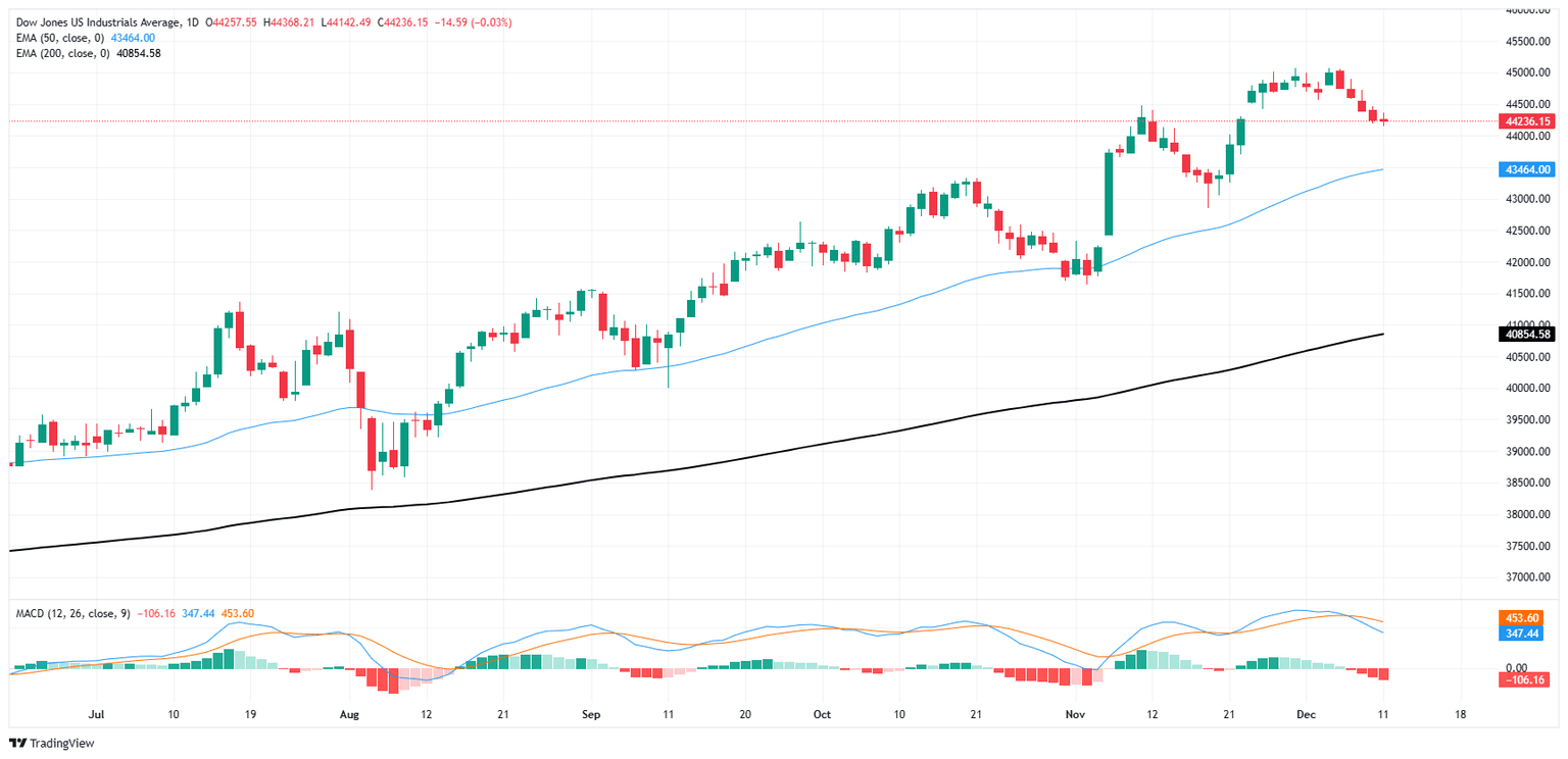 The Dow Jones is holding steady on the low end of a recent downturn. The major equity index peaked just above the 45,000 major handle just last week, and bullish momentum is taking a rare breather and allowing price action to return to some version of normalcy. The index is down 1.8% from all-time highs and treading water just north of 44,000.