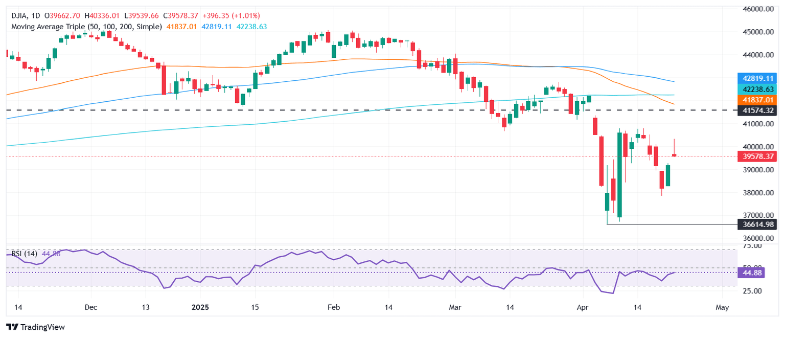 The Dow Jones Industrial Average (DJIA) rallied over 490 points or close to 1.30% on Wednesday amid traders' relief on a possible de-escalation of the US-China trade war and US President Donald Trump's comment that he doesn’t plan to remove Federal Reserve (Fed) Chair Jerome Powell. At the time of writing, the DJIA remains above 39,800 after hitting a daily low of 39,544.