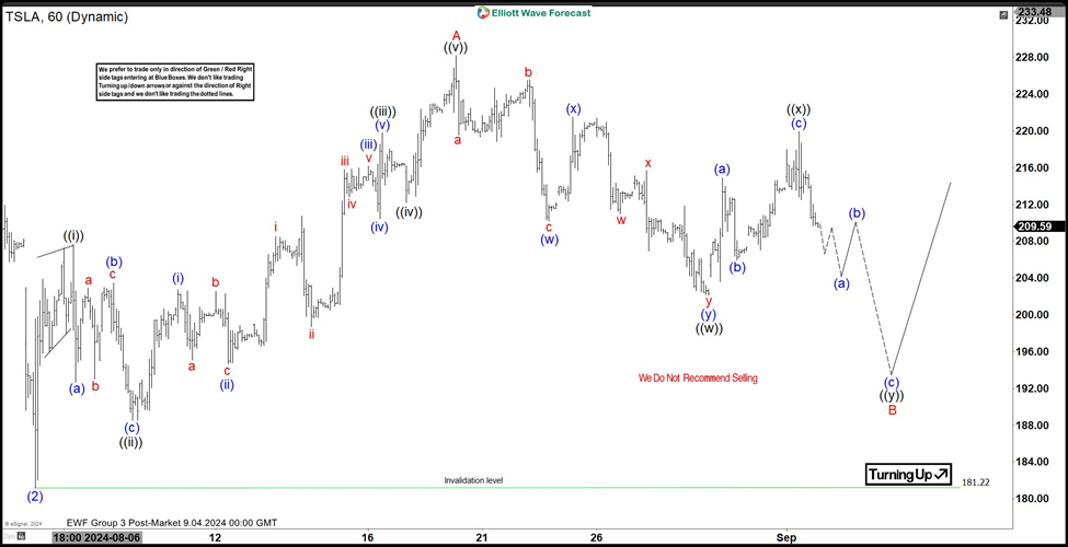 Short Term Elliott Wave in Tesla (TSLA) suggests that rally from 4.22.2024 low is in progress as a 5 waves leading diagonal. The internal subdivision of this diagonal is in 3-3-3-3-3. Up from 4.22.2024 low, wave (1) ended at 271 and pullback in wave (2) ended at 181.22. The stock has turned higher in wave (3) with internal subdivision as a 3 waves zigzag structure. Up from wave (2), wave ((i)) ended at 207.65 and dips in wave ((ii)) ended at 188.50. The stock resumed higher in wave ((iii)) towards 219.80 and pullback in wave ((iv)) ended at 212.21. Final leg wave ((v)) ended at 228.22 which completed wave A in higher degree.