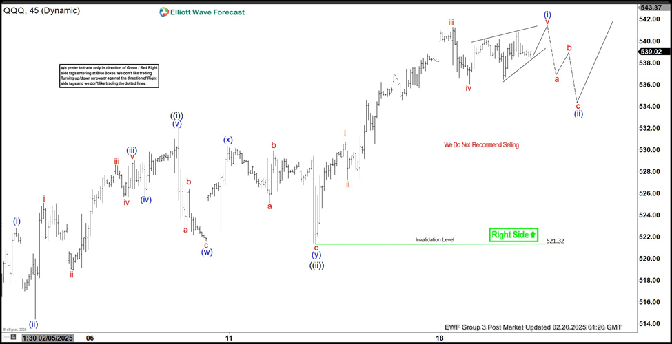 Nasdaq 100 ETF (QQQ) has broken to new all-time high suggesting the right side remains firmly bullish. The rally from 1.27.2025 low is in progress as a 5 waves with extension (nest). Up from 1.27.2025 low, wave 1 ended at 531.52 and pullback in wave 2 ended at 507.5. The ETF has extended higher in wave 3. Up from wave 2, wave ((i)) ended at 532.10. Pullback in wave ((ii)) unfolded as a double three Elliott Wave structure. Down from wave ((i)), wave (w) ended at 521.56, and wave (x) ended at 530.36. Wave (y) lower ended at 521.32 which also completed wave ((ii)) in higher degree.